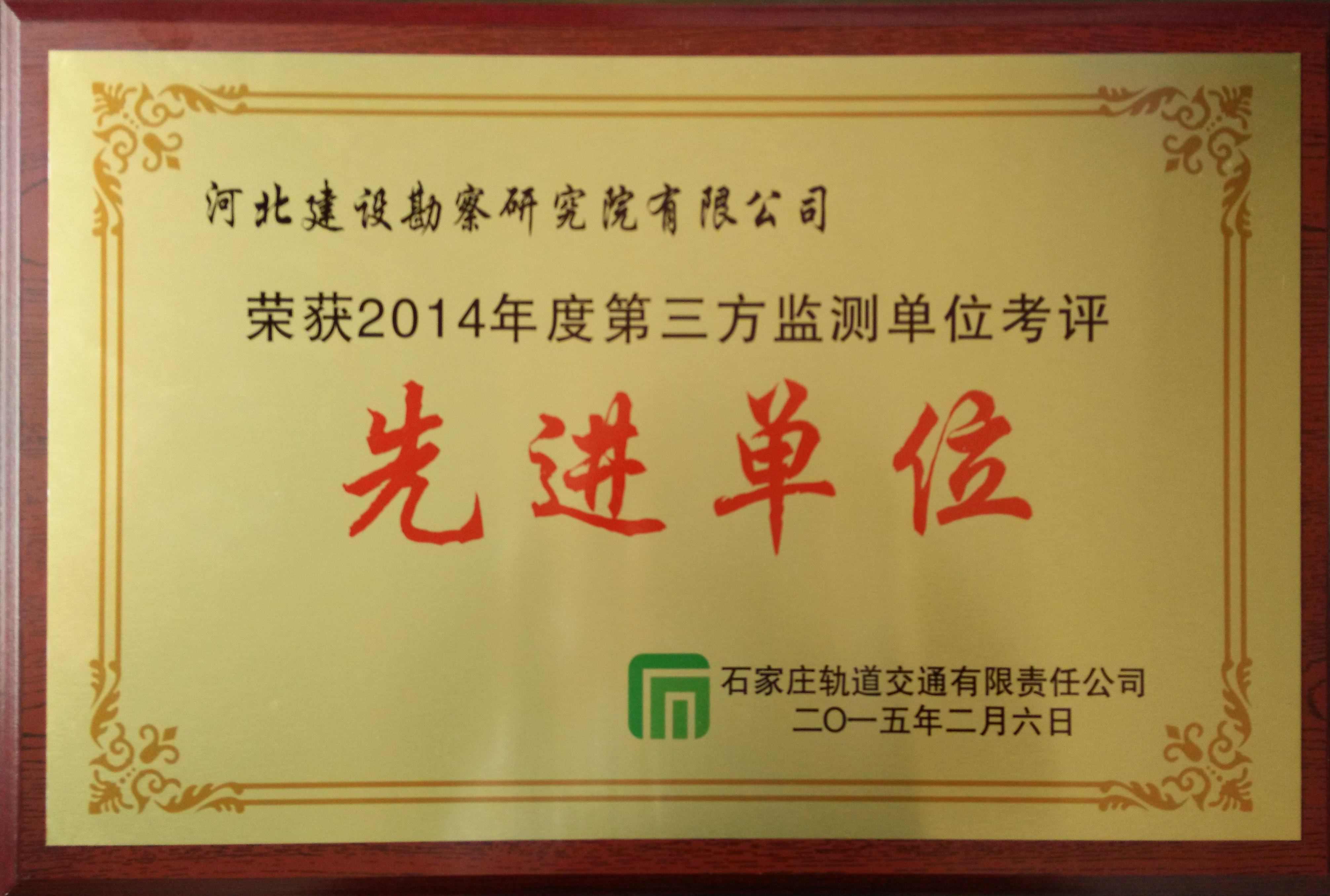 近日,我公司被石家莊軌道交通有限責(zé)任公司評(píng)為2014年度第三方監(jiān)測(cè)單位考評(píng)先進(jìn)單位?!?/span>