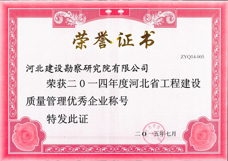 近日,根據(jù)河北省建筑業(yè)協(xié)會(huì)冀建協(xié)字[2105]25號(hào)文《關(guān)于繼續(xù)開(kāi)展河北省工程建設(shè)質(zhì)量管理優(yōu)秀企業(yè)評(píng)選表彰活動(dòng)的通知》,我公司榮獲“二〇一四年度河北省工程建設(shè)質(zhì)量管理優(yōu)秀企業(yè)稱號(hào)”。