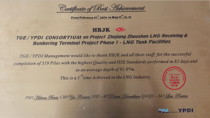 近日我公司收到TGE/YPDI的浙江舟山LNG儲罐接收站項目“最佳成績證書”牌匾,內(nèi)容:TGE/YPDI 管理層對2016年2月19日至2016年5月11日期間河北建勘及其員工以高質(zhì)量和嚴(yán)格的HSE管理標(biāo)準(zhǔn)在82天內(nèi)完成319根樁基且平均深度在91.07米的成績表示感謝。