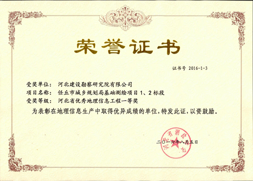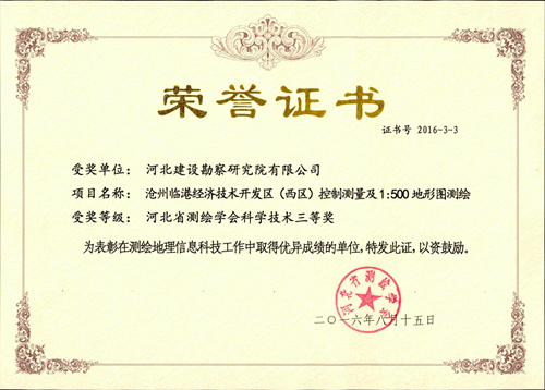 8月5日,我公司承擔的任丘市城鄉(xiāng)規(guī)劃局基礎測繪項目1、2標段被河北省測繪學會評為河北省優(yōu)秀地理信息工程一等獎;8月15日,我公司承擔的滄州臨港經(jīng)濟技術開發(fā)區(qū)(西區(qū))控制測量及1∶500地形圖測繪項目被河北省測繪學會評為河北省測繪學會科學技術三等獎。