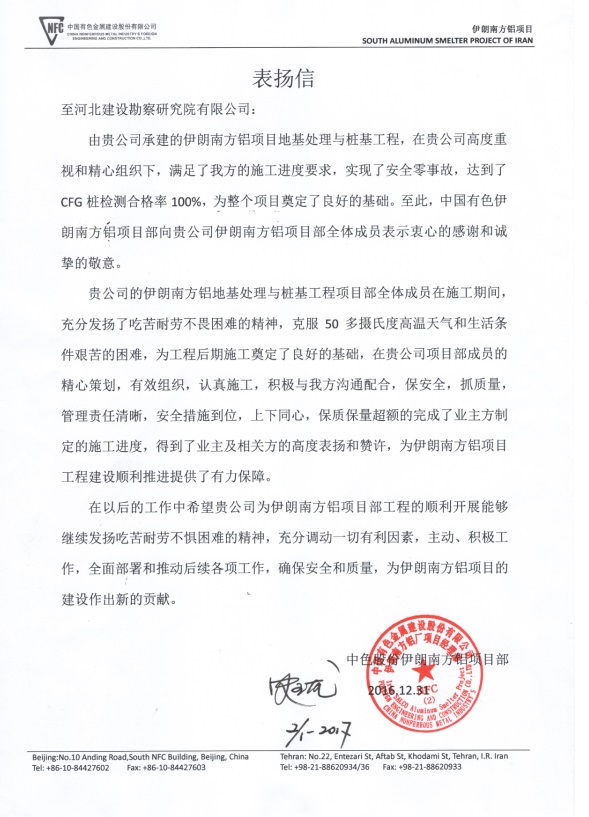 2016年12月31日,公司收到中色股份伊朗南方鋁項目發(fā)來的表揚信。由我公司承建的伊朗南方鋁項目地基處理與樁基工程,在我公司的高度重視和精心組織下,滿足了甲方的施工進度要求,實現了安全零事故,達到了CFG樁檢測合格率100%,保質保量超額完成了業(yè)主方制定的施工進度,得到了業(yè)主及相關方的高度表揚和贊許。