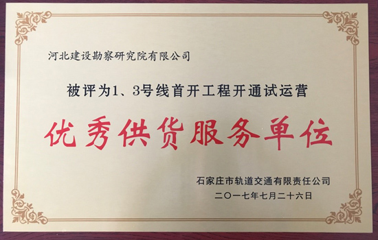 自2013年起,我單位連續(xù)4年榮獲石家莊地鐵優(yōu)秀參建單位,2017年7月,隨著地鐵1、3號線首開工程開通試運營,我單位又榮獲了1、3號線首開工程開通試運營優(yōu)秀供貨服務(wù)單位這一光榮稱號。在接下來的時間里,石家莊地鐵第三方監(jiān)測項目部仍將再接再厲,充分發(fā)揚(yáng)我單位能打硬仗,敢打硬仗的光榮傳統(tǒng),在石家莊地鐵建設(shè)新的征程中珍惜榮譽(yù),再立新功!