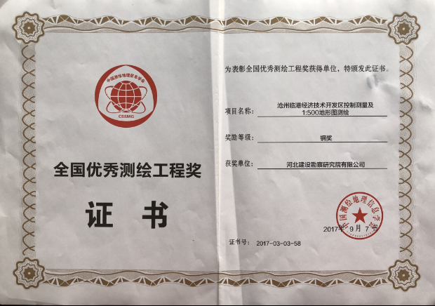 2017年9月7日,由我公司完成的滄州臨港經(jīng)濟(jì)技術(shù)開(kāi)發(fā)區(qū)控制測(cè)量及1:500地形圖測(cè)繪項(xiàng)目,被中國(guó)測(cè)繪地理信息學(xué)會(huì)授予全國(guó)優(yōu)秀測(cè)繪工程銅獎(jiǎng)。