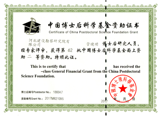 根據(jù)《中國博士后科學(xué)基金面上資助實(shí)施辦法》,公司在站博士后管曉明的《非飽和地層盾構(gòu)隧道開挖面穩(wěn)定性與控制研究》,榮獲中國博士后科學(xué)基金第62批面上二等資助5萬元。