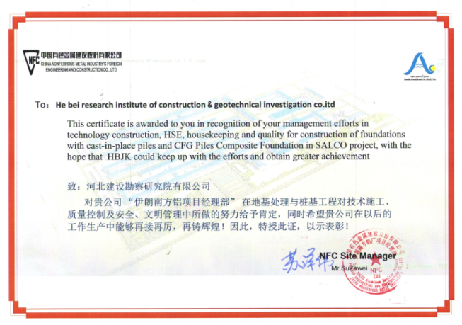 我公司承建的伊朗南方鋁項目,自開工以來精心策劃、有效組織、認真施工、積極與業(yè)主配合,保質(zhì)保量完成了施工進度。在施工過程中業(yè)主對我公司伊朗南方鋁項目部在技術施工、質(zhì)量控制及安全、文明管理中所做的努力給予了肯定,并授予表彰證書。