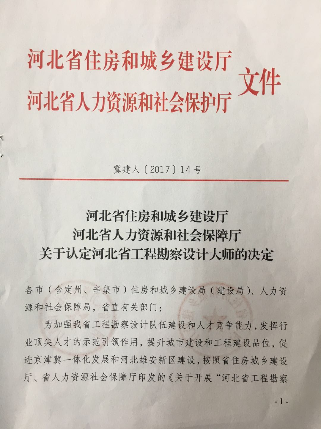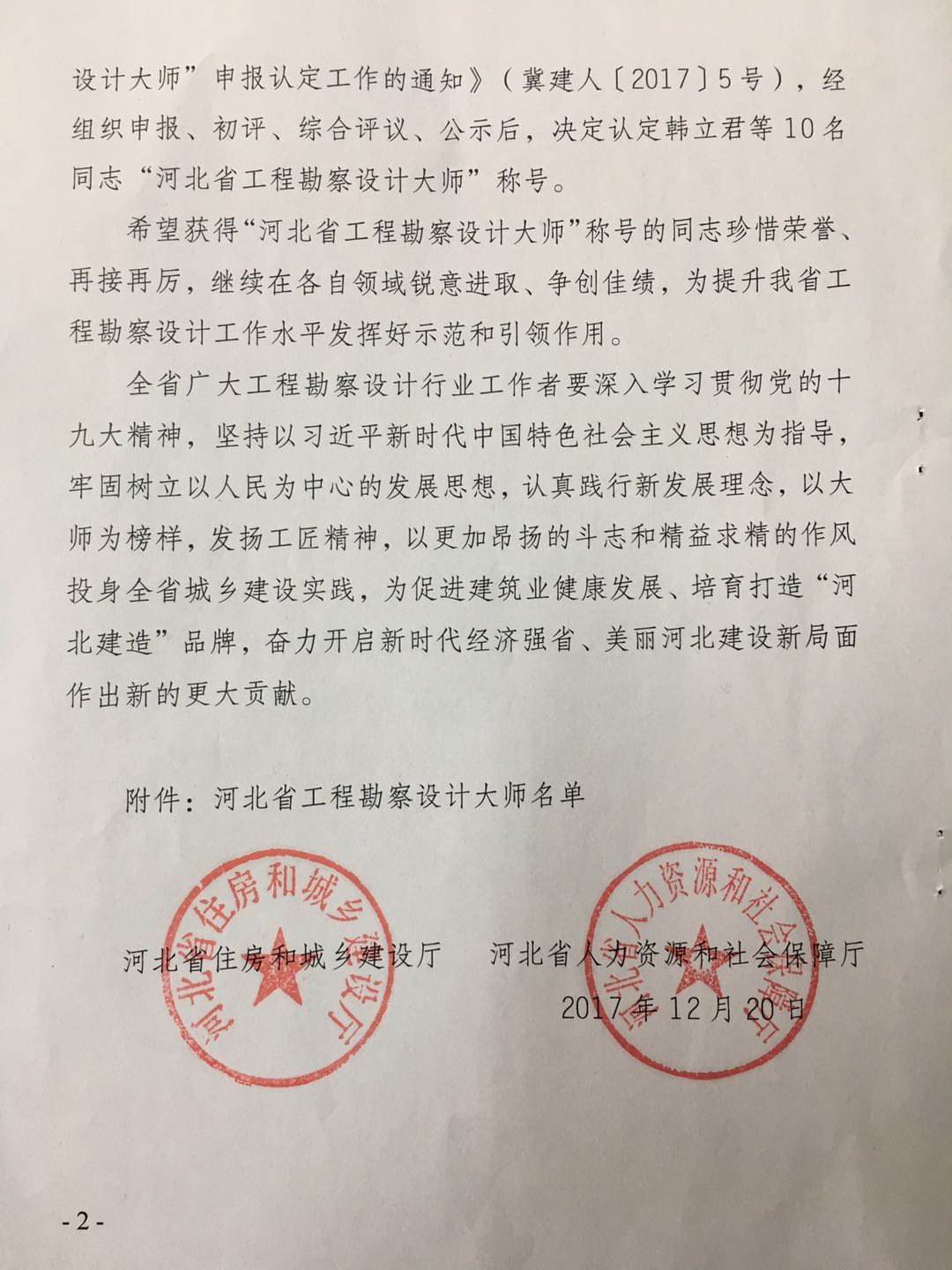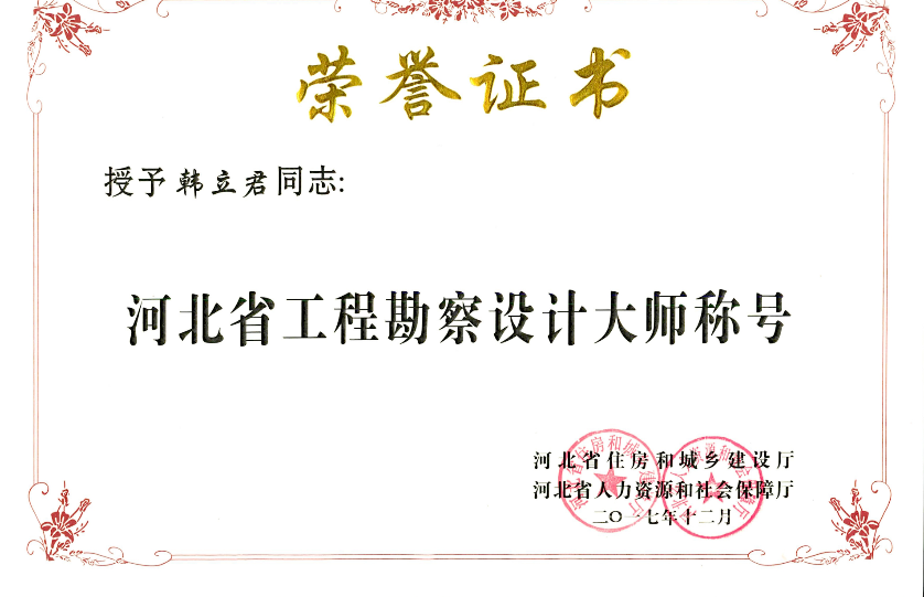 近日,從河北省住房和城鄉(xiāng)建設(shè)廳、河北省人力資源和社會(huì)保護(hù)廳聯(lián)合印發(fā)的《關(guān)于認(rèn)定河北省工程勘察設(shè)計(jì)大師的決定》獲悉,公司董事長(zhǎng)韓立君榮獲“河北省工程勘察設(shè)計(jì)大師”稱號(hào)。