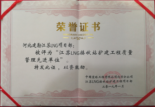 由于我公司的出色表現(xiàn),總包方中國寰球工程有限公司北京分公司對我公司和個人進行了表彰,授予我公司“質(zhì)量管理先進單位”和“HSE管理先進單位”,并對周進發(fā)、朱凱云、李友峰授予了“優(yōu)秀項目管理者”稱號,對賈沖、冀紫豪、任書星、李昭、張勇、張旺授予了“質(zhì)量管理先進個人”稱號,對劉志峰、辛朝友、邢鐸、付嘉嘉、宋江來授予了“HSE管理先進個人”稱號,分別頒發(fā)了錦旗、榮譽證書、獎牌。