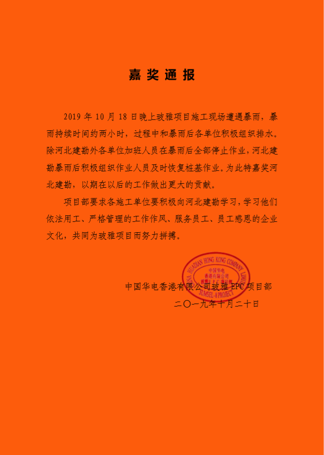 華電(印尼)玻雅項目部收到中國華電香港有限公司玻雅EPC項目部發(fā)來的嘉獎