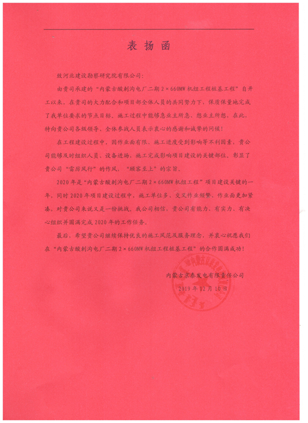 近日,由我公司承建的內(nèi)蒙古酸刺溝二期2×660WM機(jī)組工程樁基工程收到甲方內(nèi)蒙古京泰發(fā)電有限公司的表揚(yáng)信,對(duì)項(xiàng)目部全體員工的辛勤付出,給予了高度認(rèn)可和評(píng)價(jià),并為后續(xù)雙方的合作奠定了良好基礎(chǔ)。這充分彰顯了河北建勘人“雷厲風(fēng)行”的作風(fēng),“顧客至上”的宗旨。我們將繼續(xù)保持我們的施工風(fēng)范和服務(wù)理念,再接再厲,圓滿完成后續(xù)施工任務(wù)!