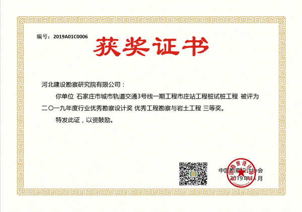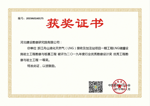 根據(jù)中國(guó)勘察設(shè)計(jì)協(xié)會(huì)下發(fā)的文件《關(guān)于公布2019年度工程勘察、建筑設(shè)計(jì)行業(yè)和市政公用工程優(yōu)秀勘察設(shè)計(jì)獎(jiǎng)評(píng)選結(jié)果的通知 》(中設(shè)協(xié)字[2019]136號(hào)),經(jīng)專家評(píng)審、中國(guó)勘察設(shè)計(jì)協(xié)會(huì)網(wǎng)站公示和中國(guó)勘察設(shè)計(jì)協(xié)會(huì)獎(jiǎng)勵(lì)委員會(huì)審定,公司申報(bào)的項(xiàng)目“浙江舟山液化天然氣(LNG)接收及加注站項(xiàng)目一期工程LNG儲(chǔ)罐設(shè)施巖土工程勘察與樁基工程”榮獲2019年度國(guó)家行業(yè)優(yōu)秀勘察設(shè)計(jì)獎(jiǎng)一等獎(jiǎng)、“石家莊市城市軌道交通3號(hào)線一期工程市莊站工程樁試樁工程”榮獲該獎(jiǎng)項(xiàng)三等獎(jiǎng)。此次獲獎(jiǎng)必將激勵(lì)我公司專業(yè)技術(shù)人員繼續(xù)發(fā)揚(yáng)刻苦創(chuàng)新精神,用心做出精品工程,為公司增光添彩!