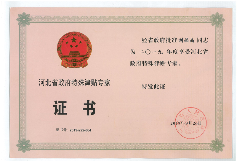 公司劉晶晶同志榮獲2019年度河北省政府特殊津貼專家稱號