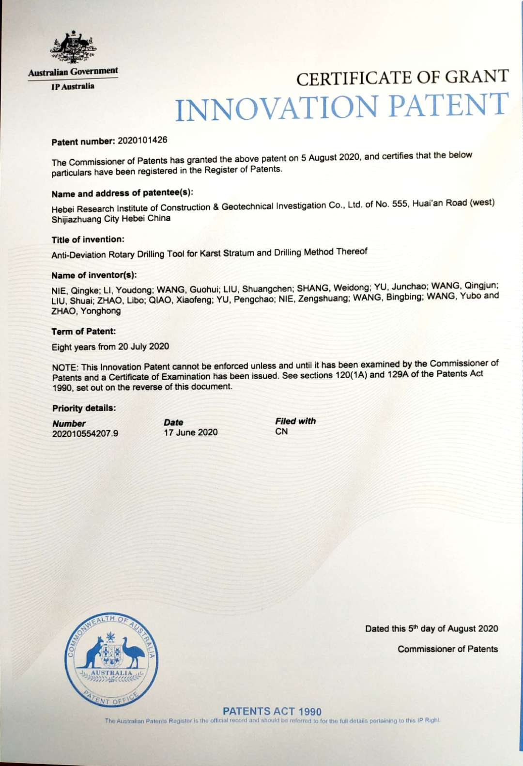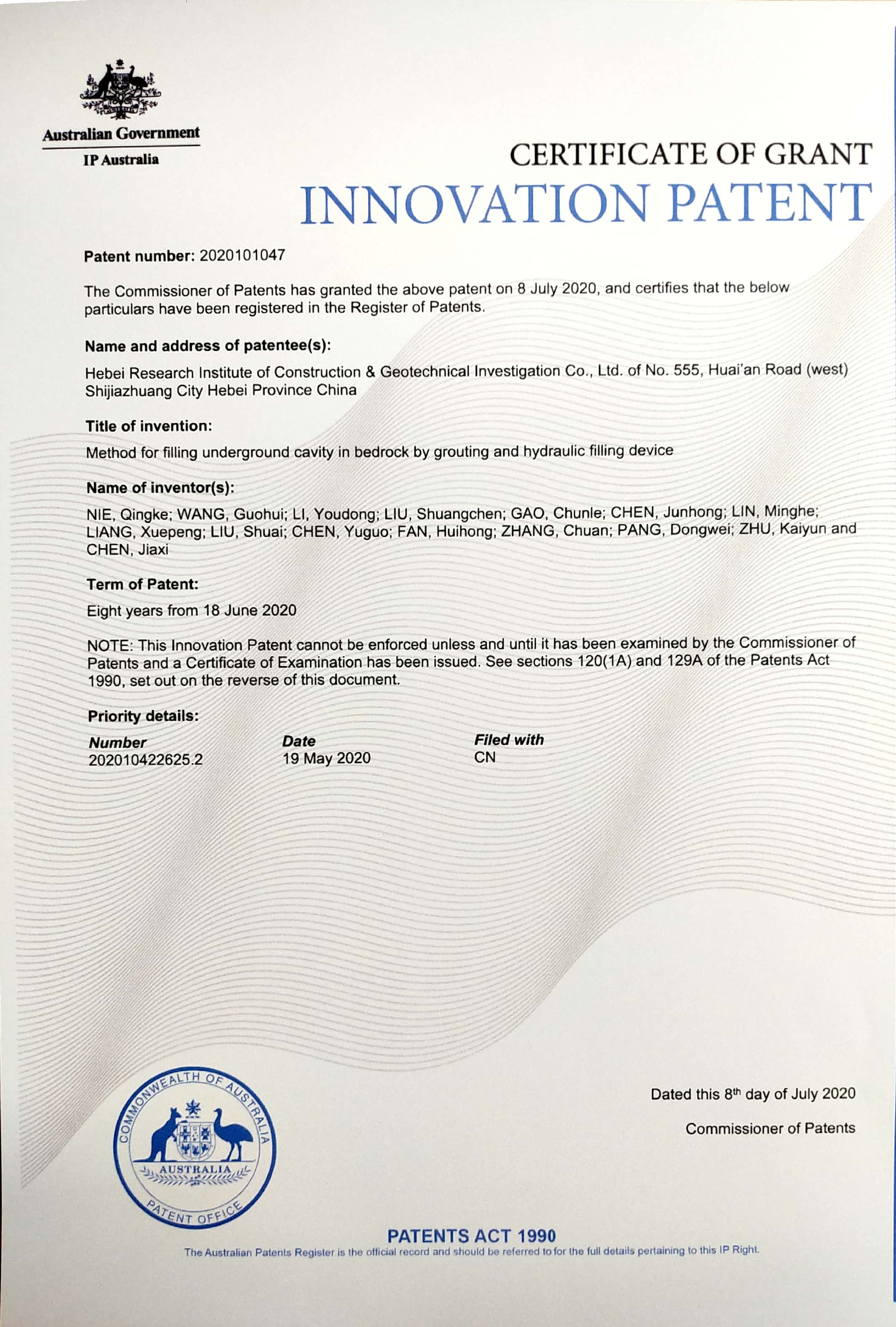 近日,由我公司開發(fā)完成的兩項(xiàng)新技術(shù):“一種填料注漿充填基巖地下空洞的方法以及一種水力充填裝置”、“一種巖溶底層旋挖鉆孔防斜鉆具及鉆孔方法”,被授予澳大利亞專利權(quán)。這是公司第一次申請(qǐng)國(guó)際專利,申請(qǐng)成功提升了公司無形資產(chǎn)價(jià)值與品牌價(jià)值,體現(xiàn)了我公司較強(qiáng)的技術(shù)創(chuàng)新能力及企業(yè)綜合實(shí)力。