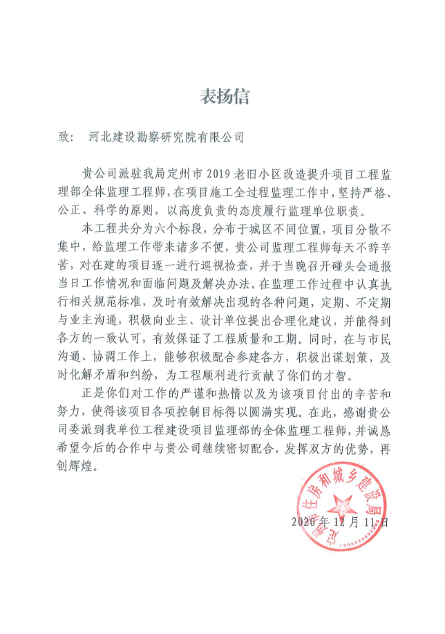 2020年12月我公司收到來自定州市住房和城鄉(xiāng)建設(shè)局關(guān)于定州市2019老舊小區(qū)改造提升項目監(jiān)理工程的表揚信,目前該項目已順利竣工驗收。雖然該項目要求時間緊、任務(wù)重,但在監(jiān)理過程中我們公司嚴格按照相關(guān)規(guī)范、標準,科學(xué)管理,嚴謹認真負責的工作作風,保證了該項目按期完工,給各方留下了深刻的印象,不僅得到了定州市住房和城鄉(xiāng)建設(shè)局的高度認可和贊譽,還贏得了周邊市民的一致好評,樹立了良好的口碑和信譽,為躋身定州建筑市場更好擴展業(yè)務(wù)奠定了基礎(chǔ)。