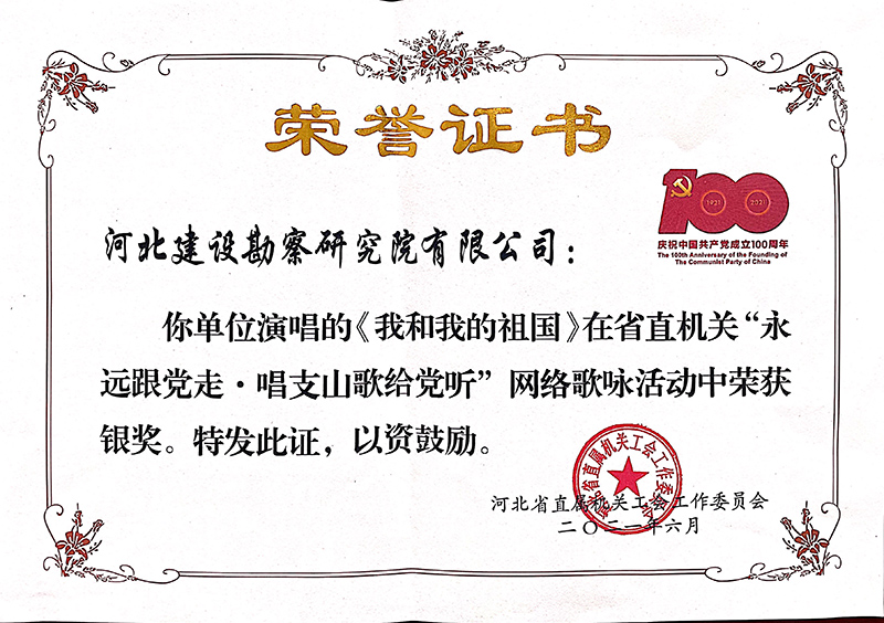 為慶祝中國(guó)共產(chǎn)黨建黨100周年,謳歌建黨百年的光輝歷程和豐功偉績(jī),今年以來(lái),公司開(kāi)展了建黨百年系列慶?;顒?dòng),并積極響應(yīng)上級(jí)黨組織工作安排,先后參加了由省直工會(huì)組織開(kāi)展的“永遠(yuǎn)跟黨走•唱支山歌給黨聽(tīng)”網(wǎng)絡(luò)歌詠活動(dòng)和省住房和城鄉(xiāng)建設(shè)廳舉辦的“唱響主旋律 頌歌獻(xiàn)給黨”歌詠比賽,用嘹亮的歌聲和飽含深情的演唱充分展示了中冀建勘人積極向上的精神風(fēng)貌,并在比賽中取得優(yōu)秀的成績(jī)。