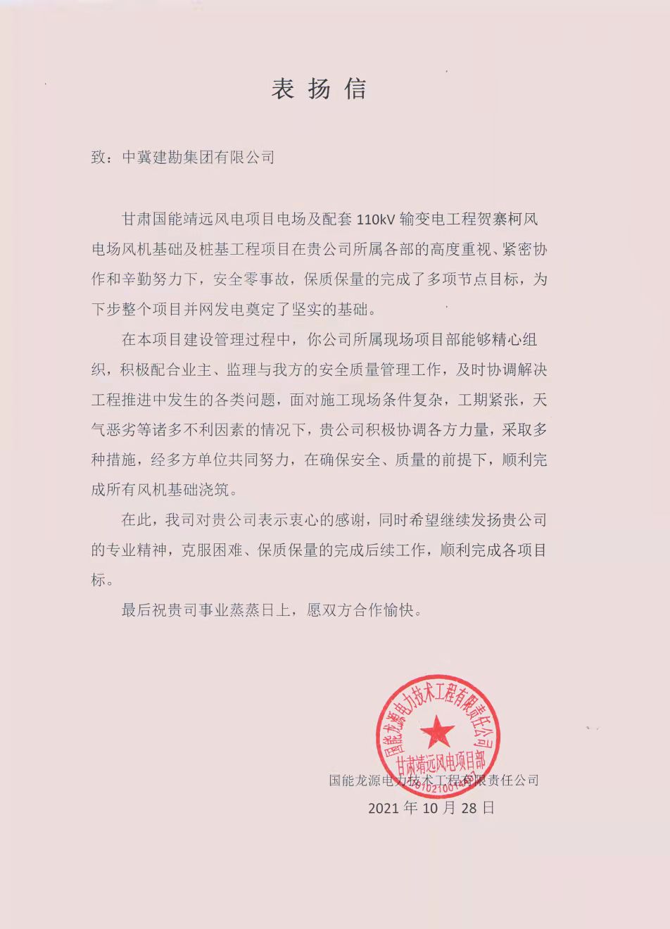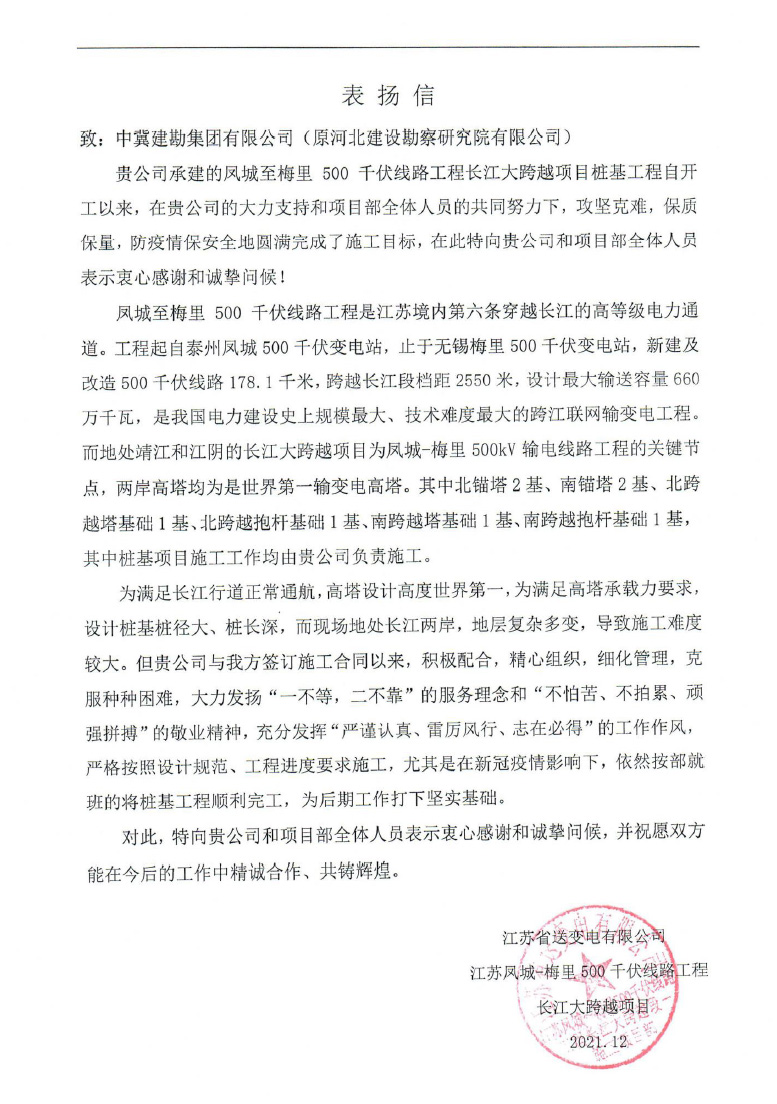 江蘇鳳城梅里500千伏線路工程長江大跨越項目樁基工程,甘肅國能靖遠風電項目電場及配套110KV輸變電工程賀寨柯風電場風機基礎(chǔ)及樁基工程項目業(yè)主向我公司發(fā)來表揚信,并頒發(fā)了“進度、質(zhì)量管理先進單位”榮譽證書,同時,武衛(wèi)新、朱凱云、黃長楠被評為“優(yōu)秀項目管理者”榮譽稱號。