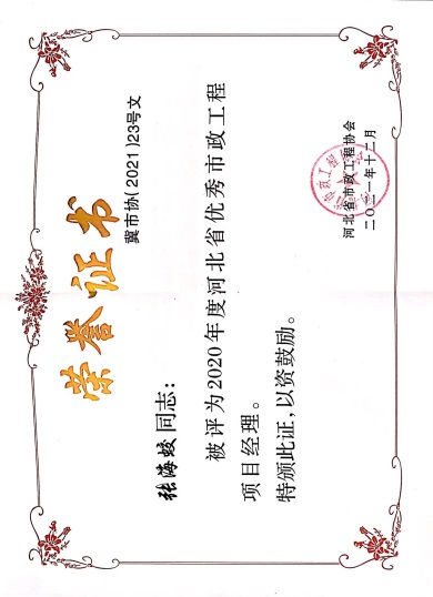 公司榮獲“河北省優(yōu)秀市政施工企業(yè)”、董事長(zhǎng)等五名同志分別榮獲榮譽(yù)稱號(hào)