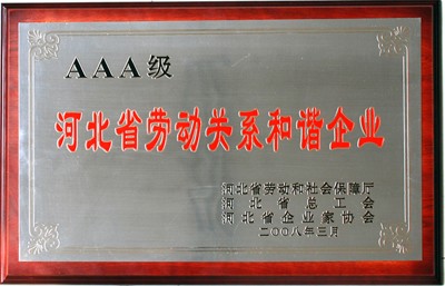 3月28日在河北會(huì)堂召開的“河北省創(chuàng)建勞動(dòng)關(guān)系和諧企業(yè)表彰會(huì)”上,我公司被授于“河北省AAA級(jí)勞動(dòng)關(guān)系和諧企業(yè)”。省委常委、省總工會(huì)主席藏勝業(yè)同志向公司董事長(zhǎng)韓立君同志頒發(fā)了獎(jiǎng)牌。