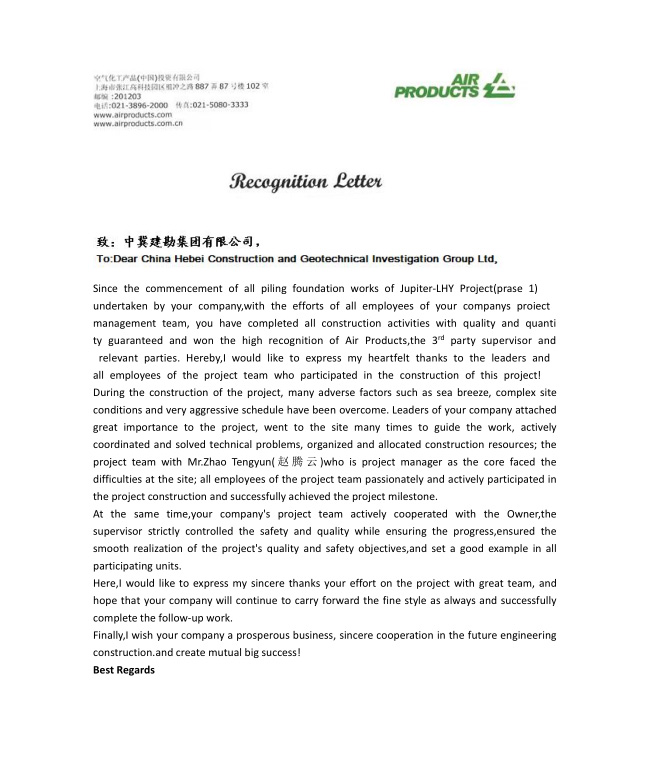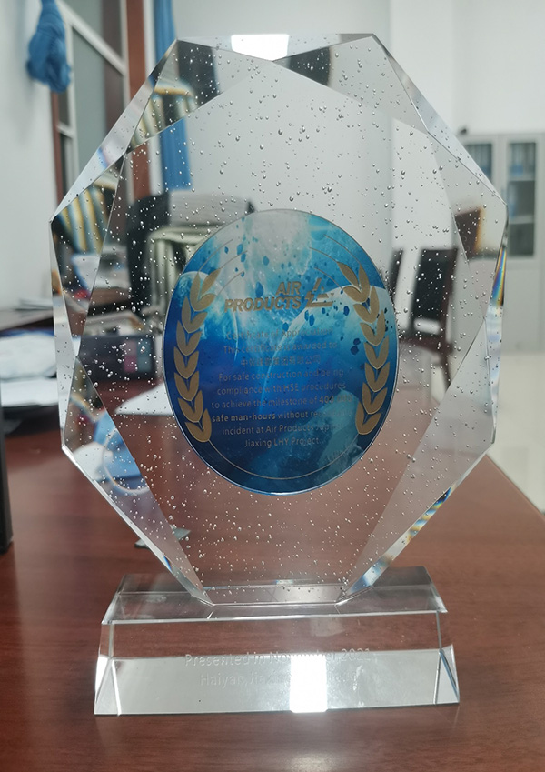 近日,我公司承建的空氣化工產(chǎn)品(浙江)有限公司海鹽氫能源和工業(yè)氣體綜合項目一期工程,收到業(yè)主頒發(fā)的“達(dá)到400000安全人工時”優(yōu)秀團(tuán)隊獎杯和表揚信。