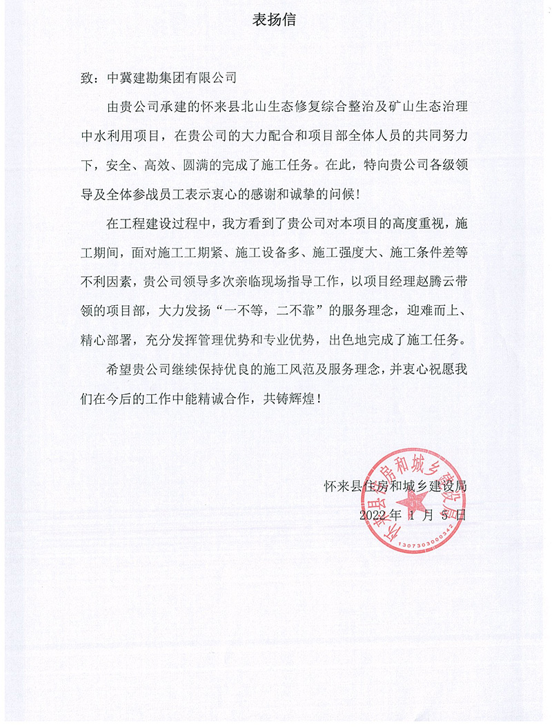 懷來縣北山生態(tài)修復(fù)綜合整治及礦山生態(tài)治理中水利用項目克服施工工期緊、施工設(shè)備多、施工強(qiáng)度大、施工條件差等不利因素,大力發(fā)揚“一不等,二不靠”作風(fēng),迎難而上、精心部署,出色的完成了施工任務(wù),受到甲方領(lǐng)導(dǎo)的一致好評。