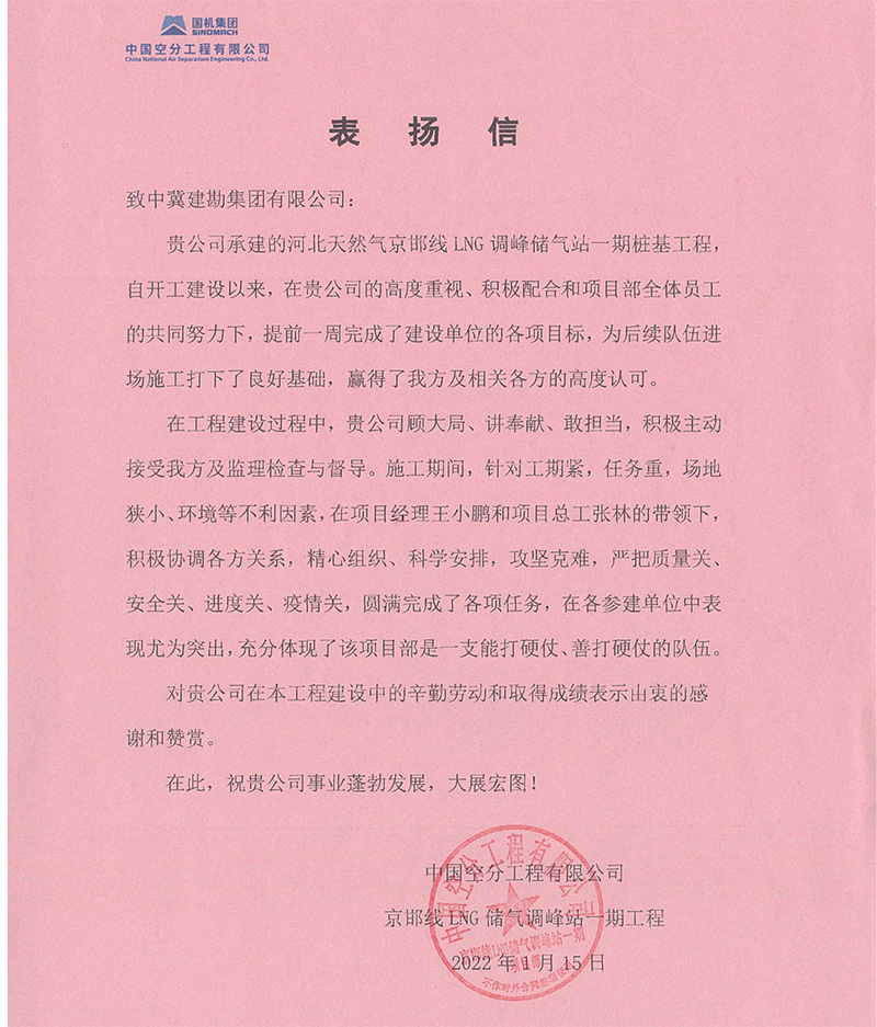 京邯線LNG儲氣調(diào)峰站一期項目樁基工程精心組織、科學(xué)安排、攻堅克難,提前一周完工交付,為上部單位進(jìn)場施工打下良好基礎(chǔ),贏得了總包方及相關(guān)各方的高度認(rèn)可。