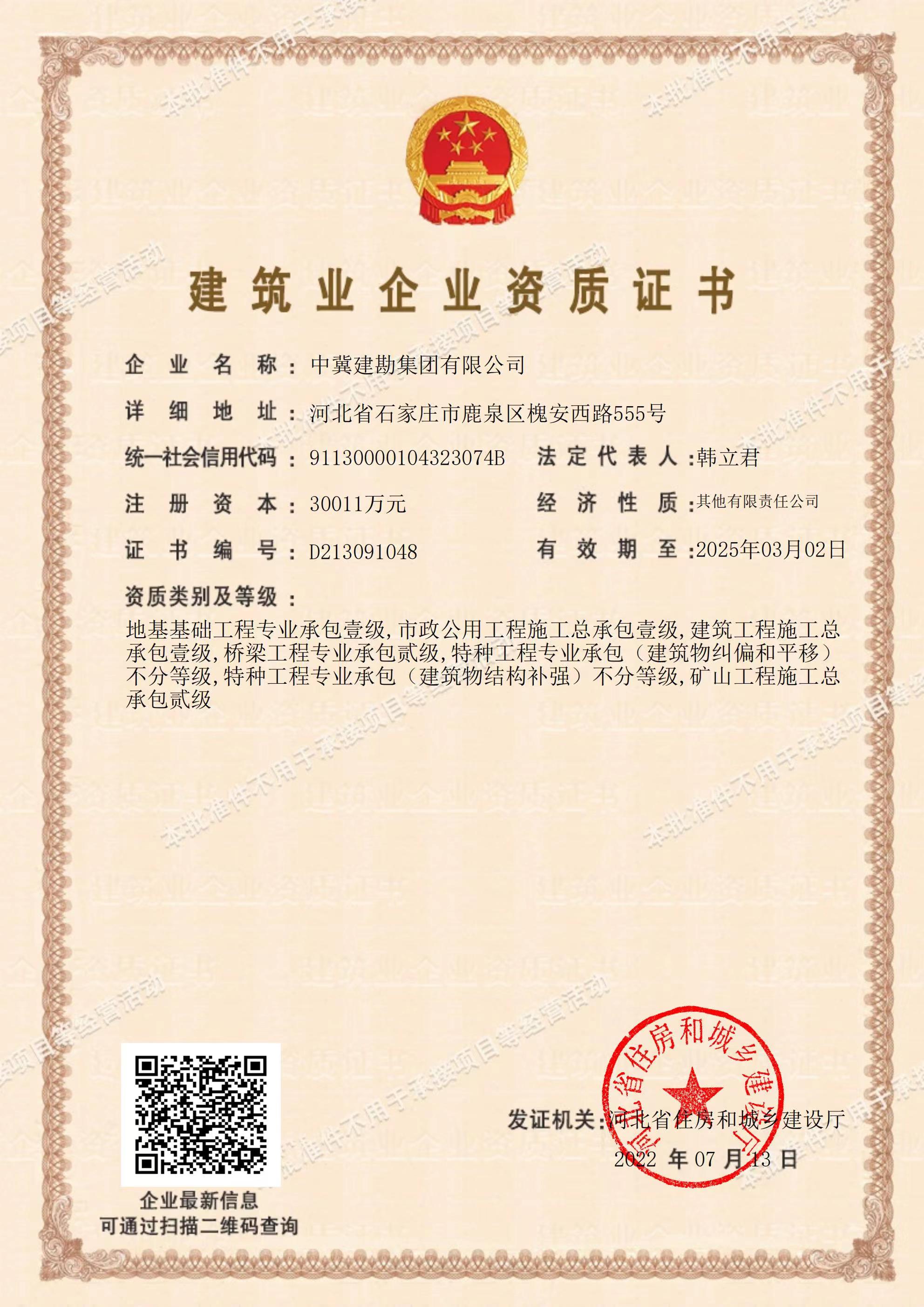 在集團(tuán)公司領(lǐng)導(dǎo)的運(yùn)籌帷幄下,經(jīng)過(guò)近半年的不懈努力,集團(tuán)公司于2022年7月13日喜獲建筑工程施工總承包壹級(jí)資質(zhì),該資質(zhì)的取得將有力促進(jìn)我公司建筑施工總承包業(yè)務(wù)開展,對(duì)公司轉(zhuǎn)型升級(jí)、地方市場(chǎng)開拓將起到重要作用,為公司持續(xù)穩(wěn)定發(fā)展奠定更加堅(jiān)實(shí)的基礎(chǔ)。