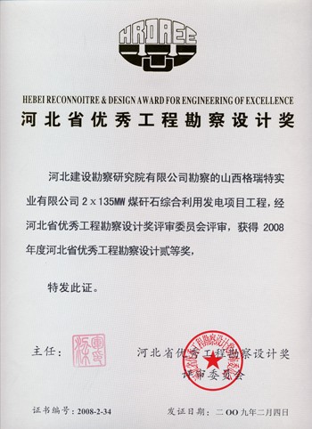 山西格瑞特實業(yè)有限公司2×135MW煤矸石綜合利用發(fā)電項目獲河北省優(yōu)秀工程勘察設計二等獎。