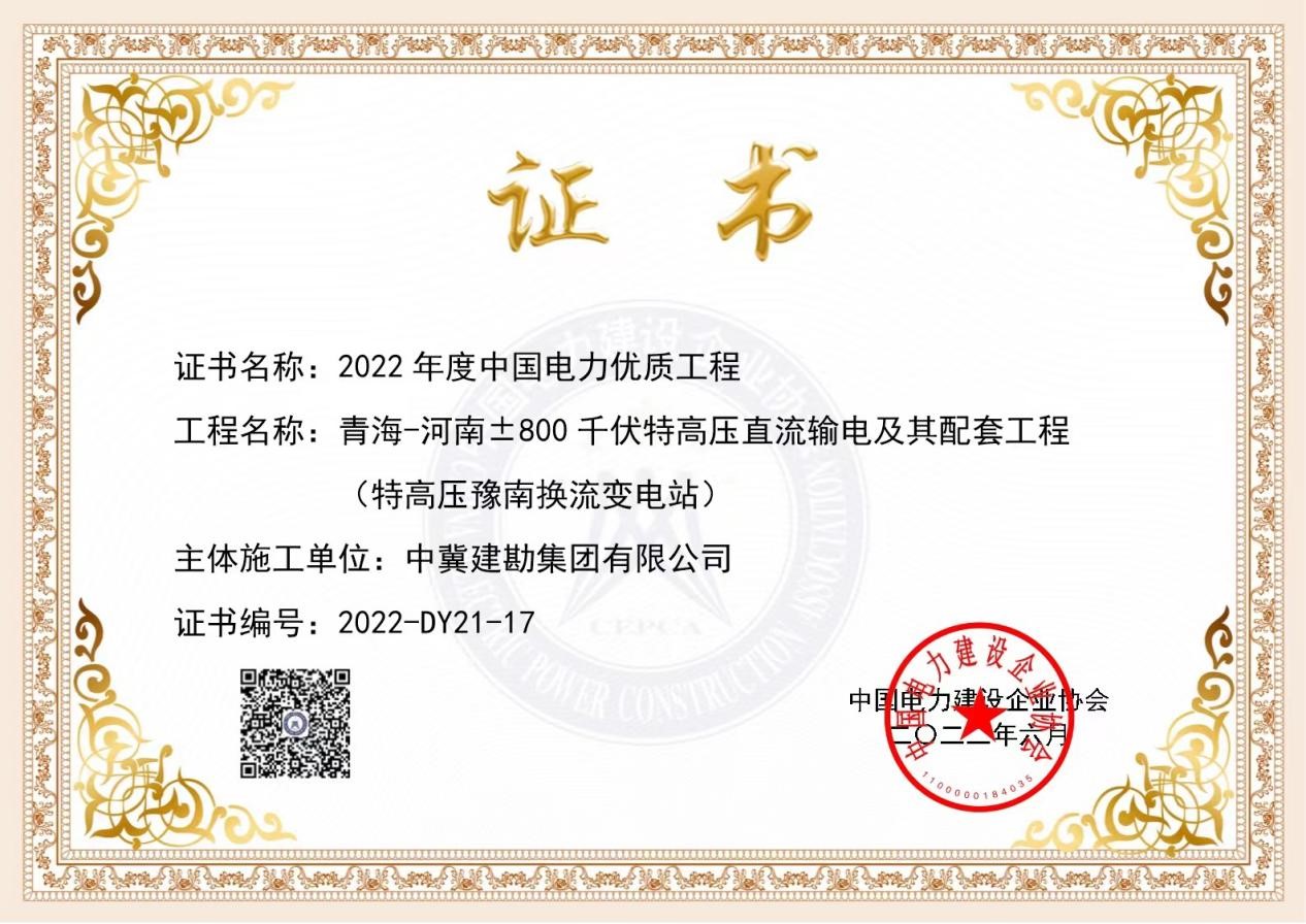 豫南換流站項(xiàng)目榮獲2022年度中國(guó)電力行業(yè)優(yōu)質(zhì)工程獎(jiǎng)