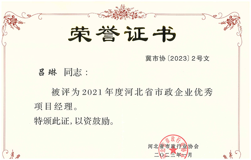 近日,經(jīng)河北省市政行業(yè)協(xié)會組織選拔并發(fā)文公布,我公司王慶軍同志、呂琳同志榮獲 “2021年度河北省市政企業(yè)優(yōu)秀項目經(jīng)理” 榮譽稱號;陳軍紅同志、張樹楹同志榮獲“2022年度河北省市政企業(yè)優(yōu)秀項目總工程師”榮譽稱號。