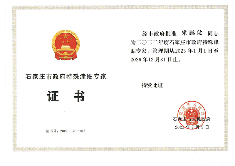 經(jīng)公司組織推薦,石家莊市人力資源和社會(huì)保障局組織評(píng)審,社會(huì)公示,石家莊市人民政府批準(zhǔn),我公司宋鵬波同志榮獲2022年度石家莊市政府特殊津貼專家。