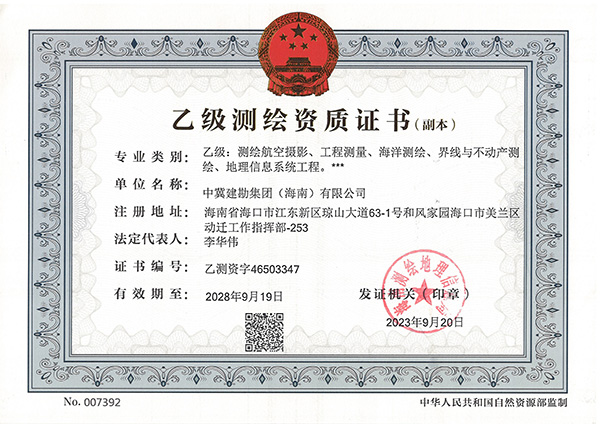 中冀建勘集團(tuán)(海南)有限公司喜獲測(cè)繪乙級(jí)資質(zhì)證書
