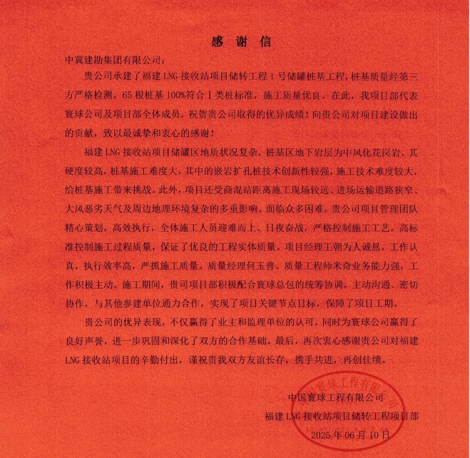 2025年6月12日,我公司收到中國(guó)寰球福建LNG接收站項(xiàng)目?jī)?chǔ)轉(zhuǎn)工程項(xiàng)目發(fā)來(lái)的感謝信。信中高度贊揚(yáng)了我公司在項(xiàng)目執(zhí)行過程中展現(xiàn)出的項(xiàng)目高效的團(tuán)隊(duì)管理、精心策劃、高效執(zhí)行。
