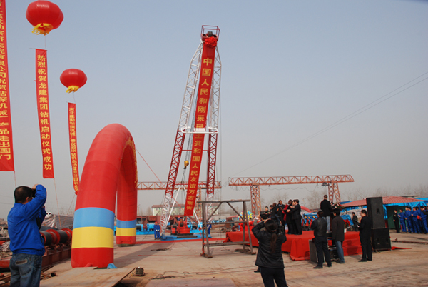 2008年12月9日,在我公司成立55周年的光輝時(shí)刻,剛果民主共和國東開賽省總督那茍伊·卡散基閣下,布卡薩先生,賽詩顧問及駐華參贊王維麗女士一行與北京龍建集團(tuán)總裁楊光烈先生,在我公司梁總經(jīng)理及鉆探機(jī)械廠馬廠長的陪同下,在機(jī)械廠南廠區(qū)參加了SPS-600鉆機(jī)、A18米鉆塔赴剛果施工的啟動(dòng)暨剪彩儀式。