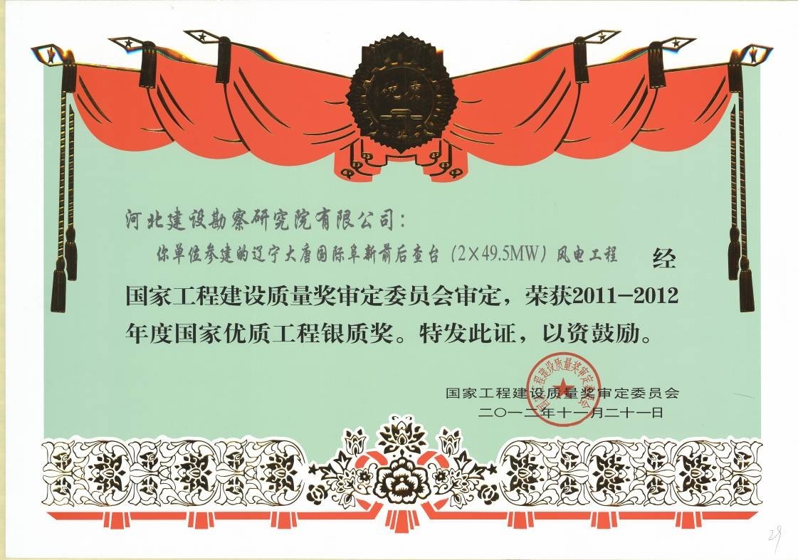 由我公司參與施工的遼寧大唐國(guó)際阜新前后查臺(tái)(2×49.5MW)風(fēng)電工程被國(guó)家工程建設(shè)質(zhì)量獎(jiǎng)評(píng)定委員會(huì)評(píng)定為2011-2012年度“國(guó)家優(yōu)質(zhì)工程銀質(zhì)獎(jiǎng)”。